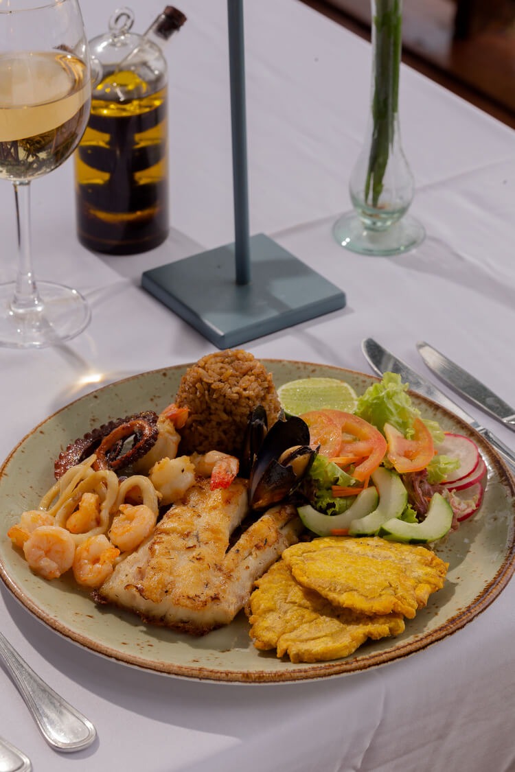 - Almuerzo según plan escogido con una entrada de chips de plátanos con hogao criollo o suero costeño más el fuerte seleccionado (pescado entero o langosta o parrillada de mariscos) más postre (dulces típicos) más bebida (agua o natural o limonada natural o jugo o gaseosa o cerveza nacional) más café colombiano o té.